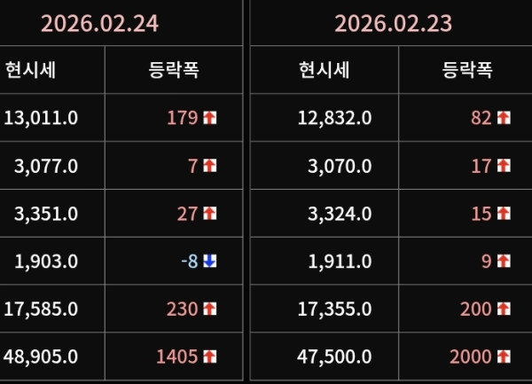 2026년 02월 24일 가격동향 페이지 정보 작성자 관리자 댓글 0건 조회 237회 작성일 26-02-25 13:08 본문 2026년 02월 24일 가격동향 목록 이전글2026년 02월 25일 가격동향 26.02.26 다음글2026년 02월 23일 字 가격동향 26.02.24 댓글목록 댓글목록 등록된 댓글이 없습니다.