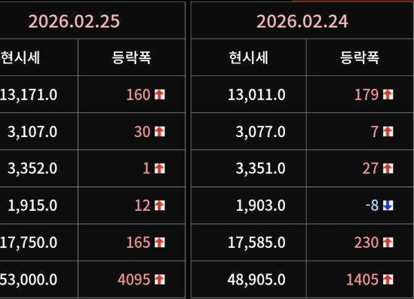 2026년 02월 25일 가격동향 페이지 정보 작성자 관리자 댓글 0건 조회 202회 작성일 26-02-26 08:10 본문 2026년 02월 25일 가격동향 목록 이전글2026년 02월 26일 字 가격동향 26.02.27 다음글2026년 02월 24일 가격동향 26.02.25 댓글목록 댓글목록 등록된 댓글이 없습니다.